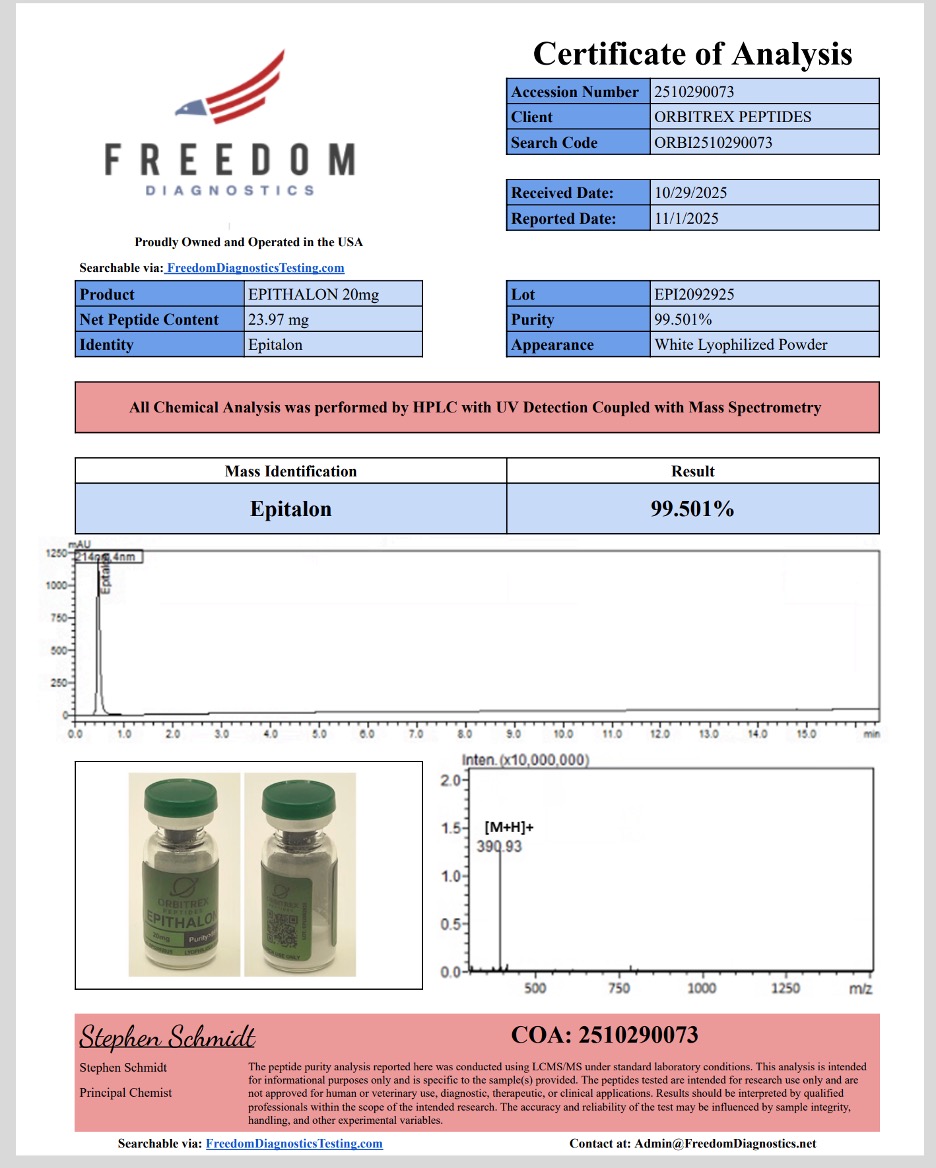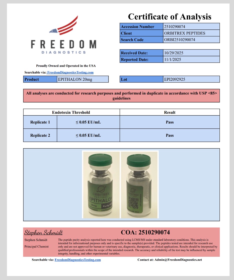 Disclaimer: All products listed by Orbitrex, including the Epithalon 10mg Peptide, are sold strictly for in-vitro laboratory research and analytical purposes only. They are not intended for human consumption, ingestion, diagnostic, therapeutic, or agricultural use. Our products are not FDA-approved for human use. Any communications implying human use, clinical trials on unapproved human subjects, or bodily injection will result in the immediate cancellation of your account and permanent restriction from our supply chain. All researchers must adhere to their local institutional review board (IRB) guidelines when handling these research materials.